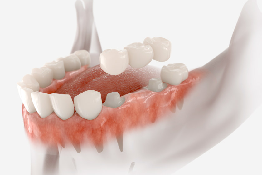ブリッジとは失った歯の両隣を削って土台にし、橋渡しのように被せものをすることで欠損部分の歯を補う治療のこと。