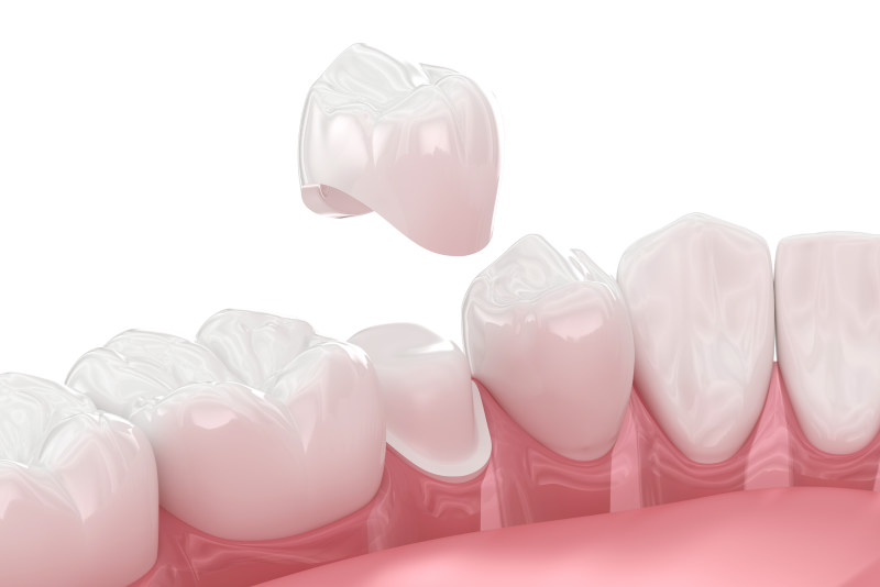 進行した虫歯などで歯が大きく欠けた場合に、クラウンという被せもので歯を補う治療法です。歯の表面を削り、残っている歯根を土台としてセラミックを被せます。
