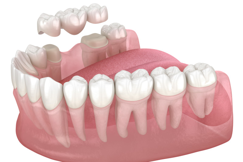 その名の通り、橋をかけるようにして失った歯を補うブリッジ。歯がなくなった部分にダミーの歯を作り、その両隣の歯を支台としたクラウンを橋渡し状に連結させることで、欠損歯を補う治療法です。