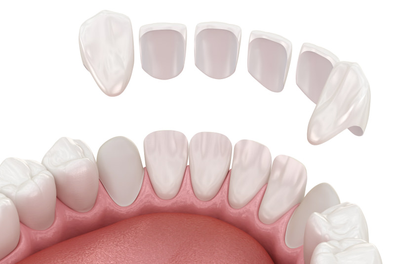 薄く削った歯の表面に、つけ爪のようなセラミックの薄いチップを貼りつける治療法です。手軽に歯の見た目や形、色を整えることができます。
