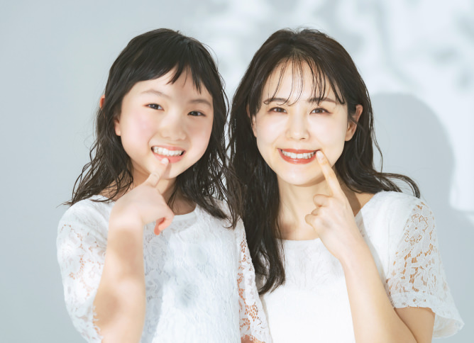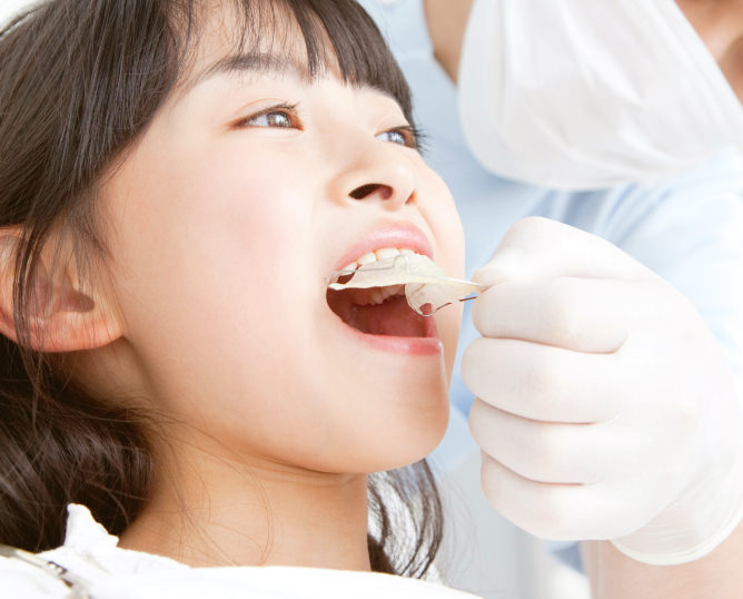 小児矯正とは、永久歯に生え変わる時期に矯正治療を行い、歯や顎の発育をサポートしながら正しい歯並びに導きます。矯正効果の高い固定式と目立ちにくいマウスピースタイプがあり状態や子どもの性格に合わせ矯正治療を行います。