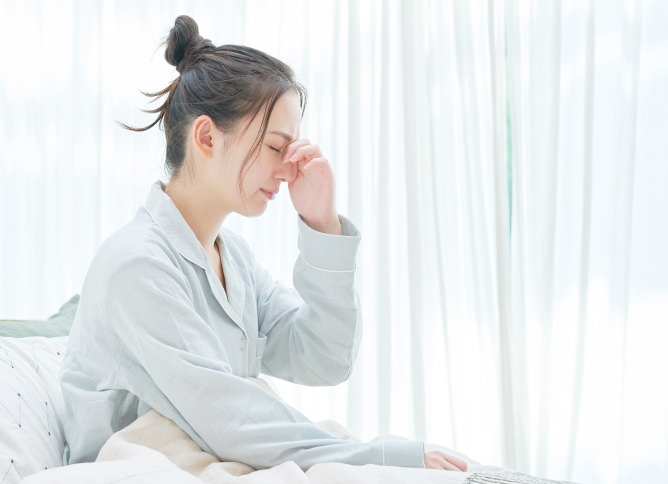睡眠中に無呼吸や低呼吸を繰り返すため、適切な換気ができずに低酸素状態に陥るだけでなく、高炭酸ガス血症を引き起こす原因にも。夜間に脳が覚醒を繰り返すことで睡眠の質は低下。これらの要因が、起床時の頭痛や倦怠感を生じさせるのです。
